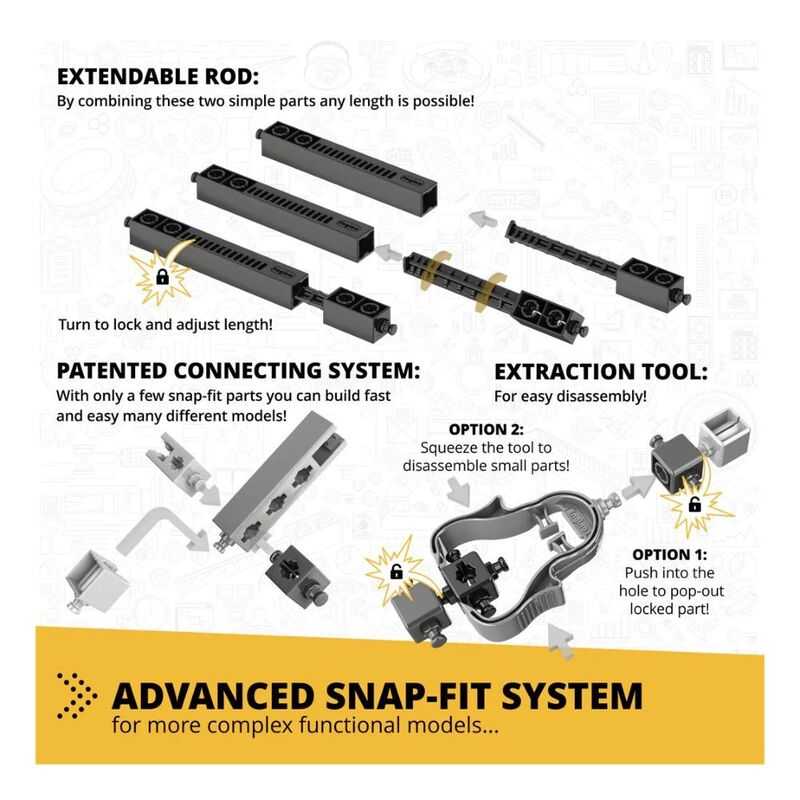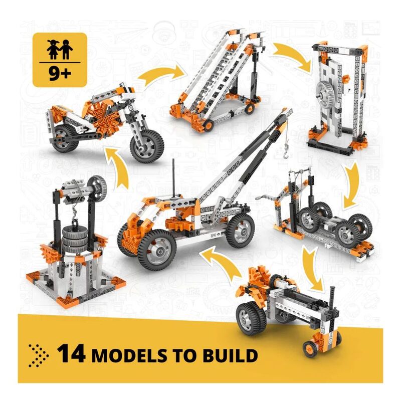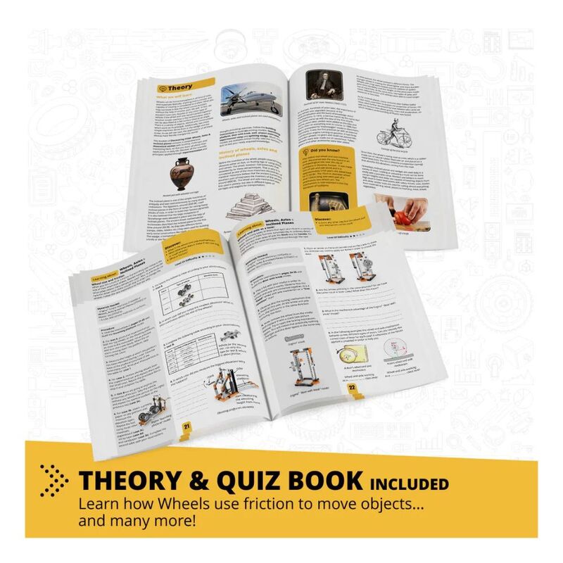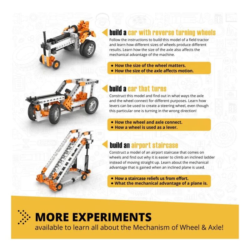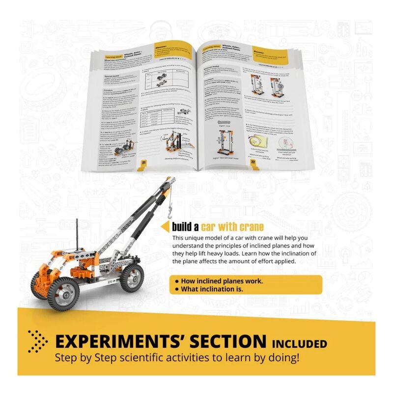 Learn how wheels and axles use friction to move objects easily and how big tires compare to small tires. Find out how an inclined plane can be used for lifting heavy objects and how another form of inclined plane, the wedge, is used in everyday applications. Build 14 working models such as a launching platform, a door with knob, a well, an airport staircase, an experimental ramp and a splitting wedge. You can find easy-to-follow building instructions for all models either online or in the booklet included. The booklet provides detailed explanations of the different scientific principles applied and incorporates innovative experimental activities for hands-on learning. A Quiz section is also available to challenge your newly acquired knowledge!
