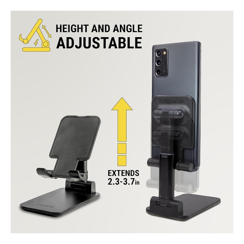 - Both height and angle can be adjusted with the extendable arm and pivoting phone mount.