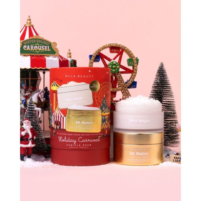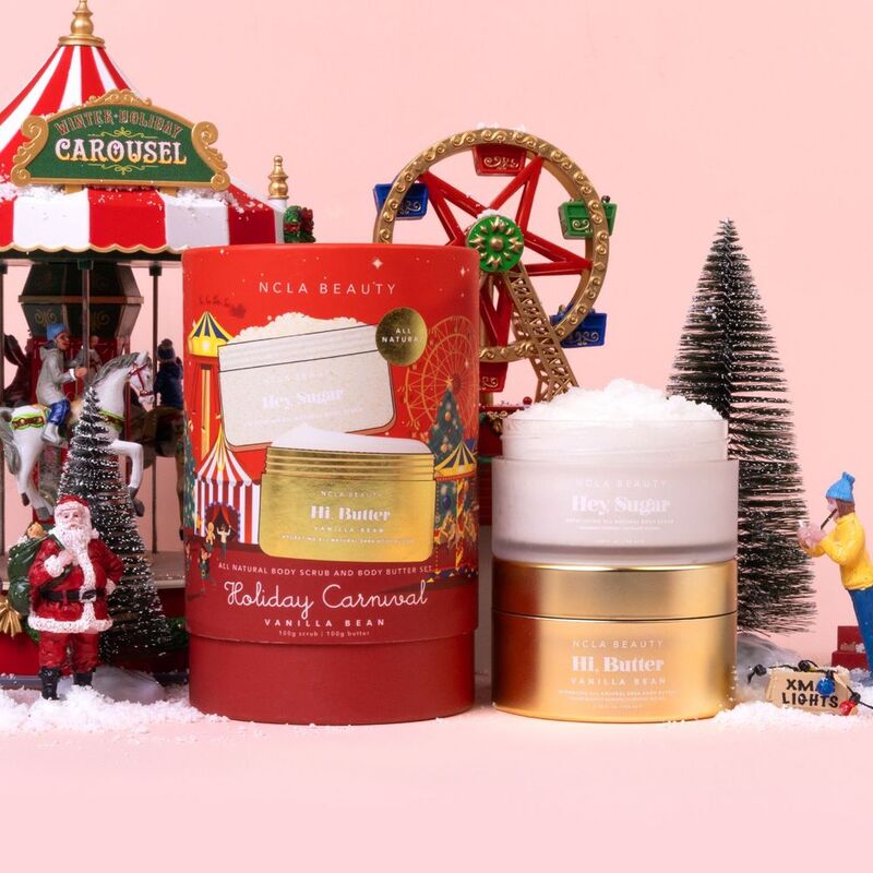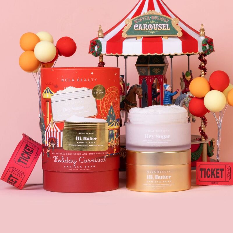 Your skin’s VIP ticket to soft, smooth skin. Our festive holiday carnival vanilla bean body scrub and body butter make skincare go a merry-go-round!