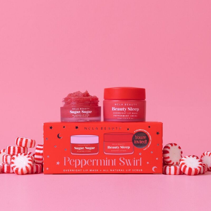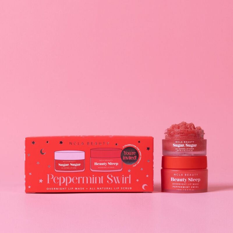 A holiday gift set complete with Beauty Sleep Peppermint Swirl overnight lip mask and a exfoliating lip scrub. This powerful slumber duo works together to exfoliate and drench lips with hydration.