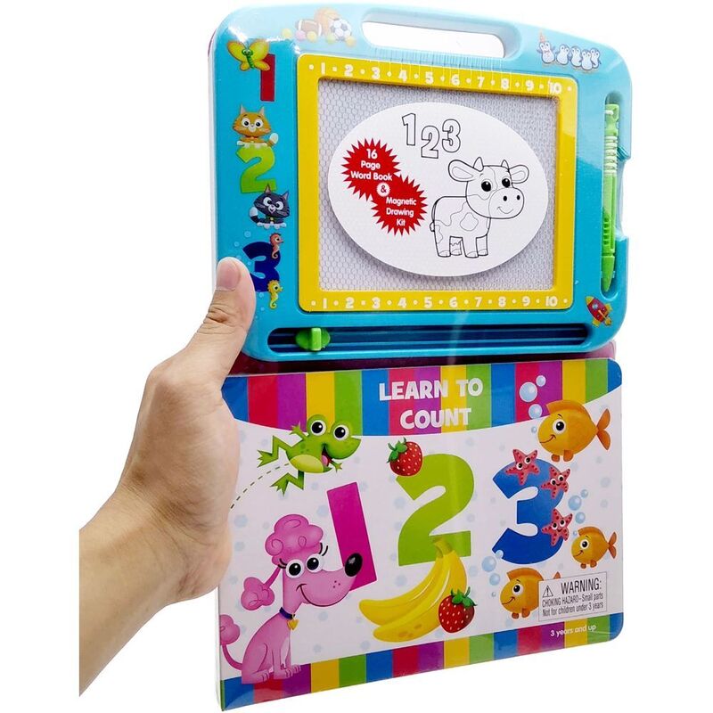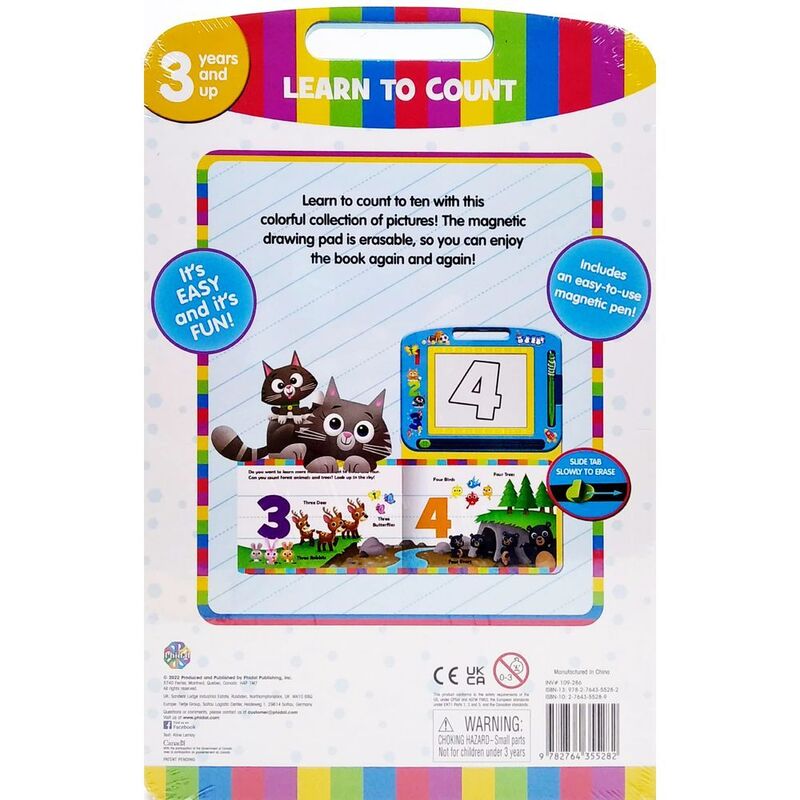 Learn how to write and draw letters, numbers, and a multitude of objects, all in the company of familiar faces! The Learning Seriesoffers a creative experience that includes a fun story, step-by-step instructions, a magnetic pen, and an erasable magnetic drawing pad that can be used again and again! Learn to write the numbers with this playful collection of pictures! Follow the arrows to trace each number from 1 to 10. 3/4 " x 13 " Page ISBN13/ Age years and up © PHIDAL
