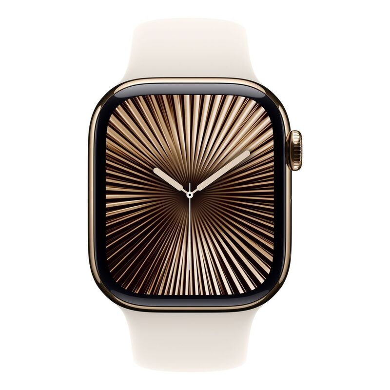 Made from a custom high-performance fluoroelastomer, the Sport Band is durable and strong, yet surprisingly soft. The smooth, dense material drapes elegantly across your wrist and feels comfortable next to your skin. An innovative pin-and-tuck closure ensures a clean fit.