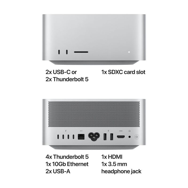 Four Thunderbolt 5 (USB‑C) ports, Two USB 3 (USB‑A) ports (up to 5Gb/s), HDMI 2.1 port, 10Gb Ethernet, 3.5 mm headphone jack, Two USB‑C ports (up to 10Gb/s), SDXC card slot (UHS-II)