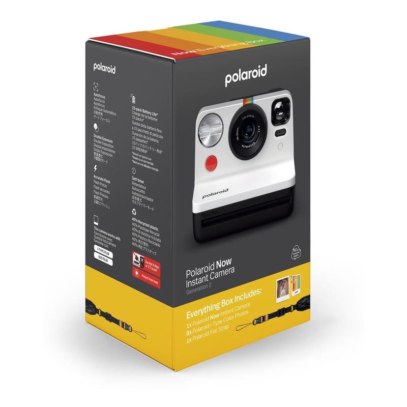 Get started in the instant film world with this Polaroid Now Everything Box, which includes a Black & White Polaroid Now instant film camera along with a double pack of color i-Type instant film, giving you 16 exposures to begin shooting. It also includes a black and white flat strap to keep your camera safe. Polaroid's new point-and-shoot analog instant camera has all you need to catch every life moment in an original Polaroid photograph. Now with autofocus, it's simple to capture moments as you see them, so you can relive them forever in sharp, vivid color. Frame two moments in one with double exposure, or get yourself in the picture with self-timer and an accurate flash to make everyone look like they should.