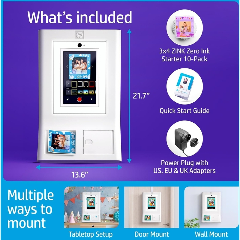 Take your next event to the next level with the HP Sprocket Photobooth Portable Printer! This one-of-a-kind photobooth instant photo printer lets you instantly take and share fun, customized photos on 3x4” sticky-backed photo paper. Simply choose from the available categories of the portable wireless printer to find the perfect layout for your event, select and customize your frames and filters and get the photobooth magic started! The 10.1” adjustable LCD touch screen of the HP Photo Printer offers a live view of your photos with layouts and filters applied, so you can make sure your photo looks just right before capturing the moment. And, with an LED ring light and flash built-in, you can confidently capture every detail in clear, bright color. When your photo is ready, sharing is easy. Simply hit print on the instant picture printer and watch as your photo instantly prints without the need for expensive ink or toners on ZINK paper. With this portable photo printer, your sticky-backed prints come out smudge-proof, water-resistant, and tear-resistant, so you can stick them anywhere and know they’ll last. Connect to Wi-Fi and easily generate a QR code for fast and easy photo sharing and downloads. With this HP Sprocket Photo Printer your can snap, print, and share the instant photo fun!