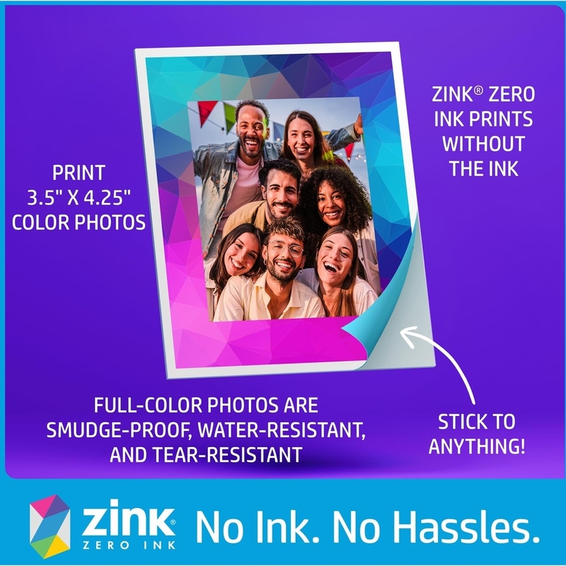 • No Ink. Print photos on Zink paper, which resists water, smudges, and tears, and stick them anywhere.