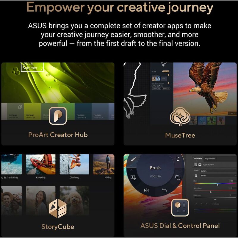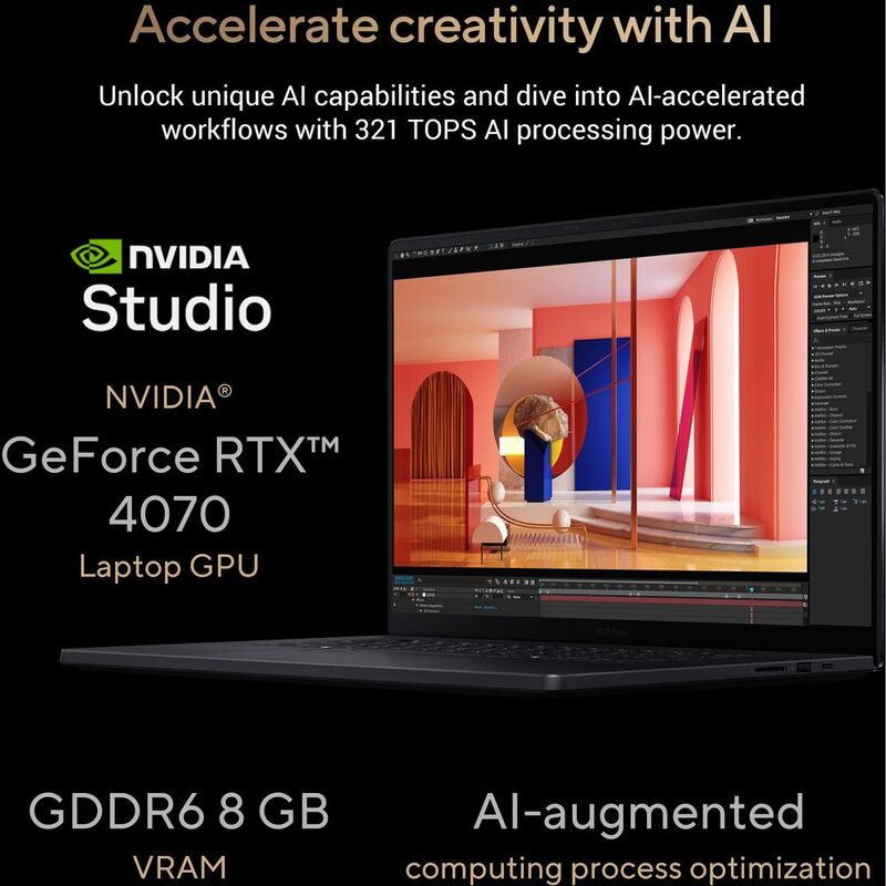 Meet ProArt P16 – your ultimate creative companion for the studio and on the move. Its OLED touchscreen ensures precise color accuracy for flawless proofing, while versatile I/O ports seamlessly connect all your peripherals. This NVIDIA® Studio-validated laptop packs a GeForce RTX™ 40 Series Laptop GPU, providing powerful graphics and 321 TOPS AI performance. Additionally, it features up to a 50 TOPS AMD Ryzen™ AI 9 HX 370 processor, delivering exceptional processing power. With AI-enhanced creative features, military-grade toughness, and a long-lasting battery, ProArt P16 transforms any setting into your studio.