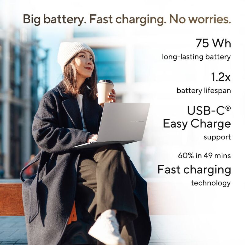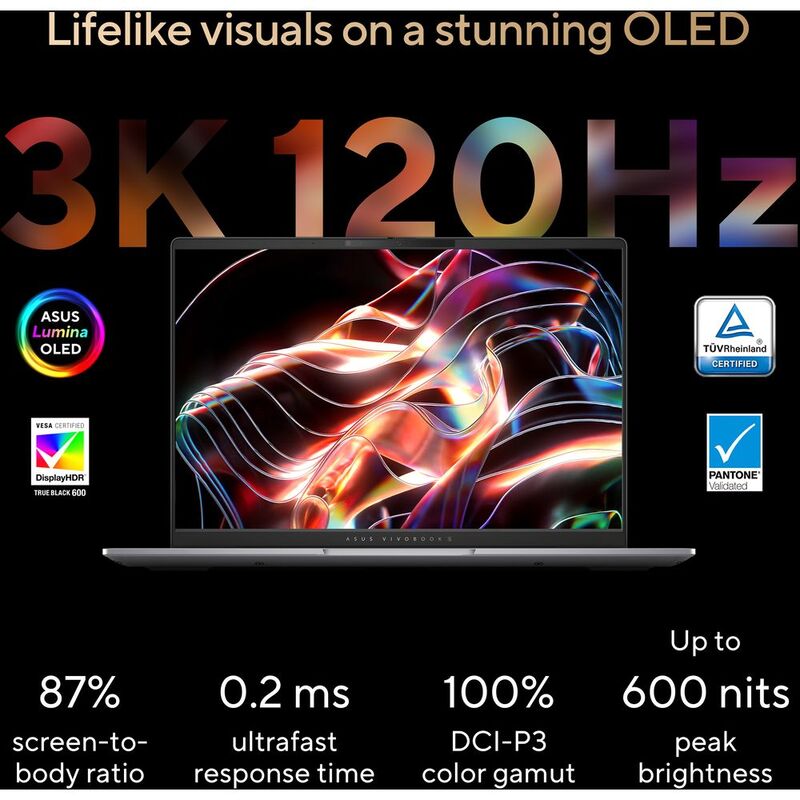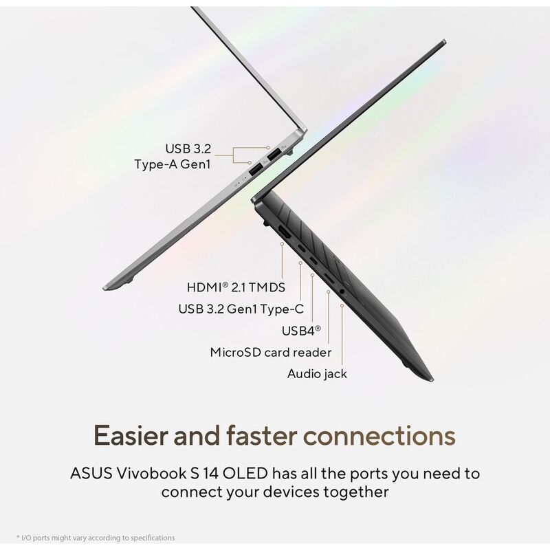 Measuring a slim 1.39 cm and weighing just 1.3 kg, ASUS Vivobook S 14 OLED epitomizes portability. It’s effortless to take with you, whether you’re on the move or switching spaces. Enjoy the freedom to work and play on the go without heavy gear, in one super-stylish package