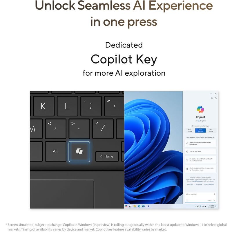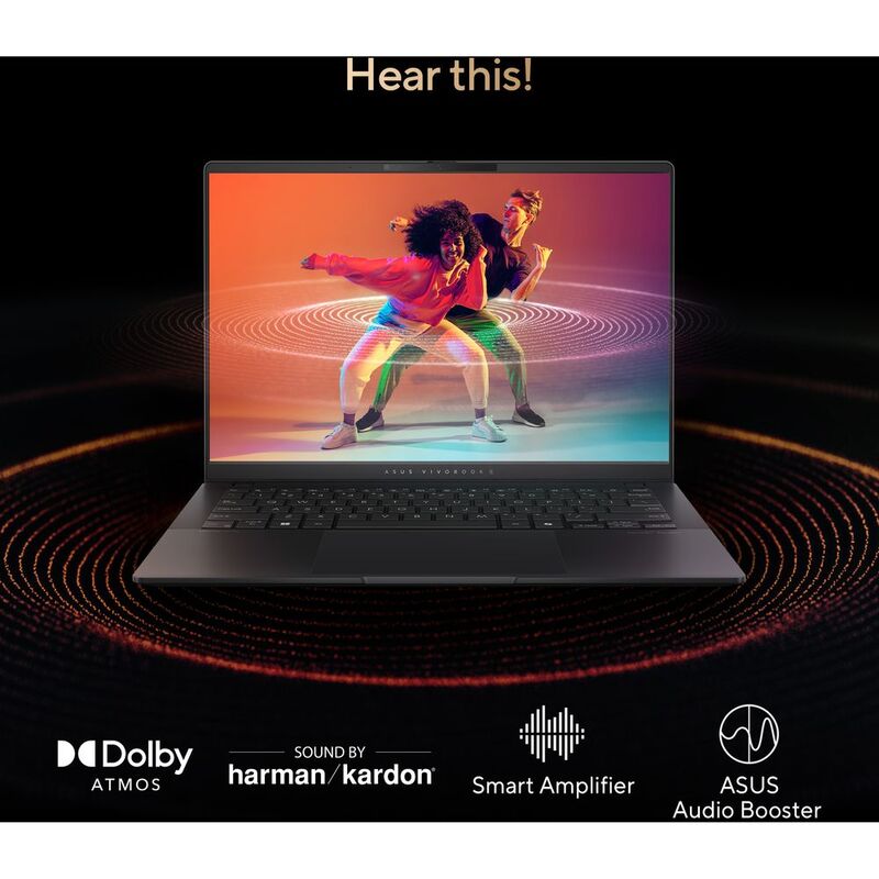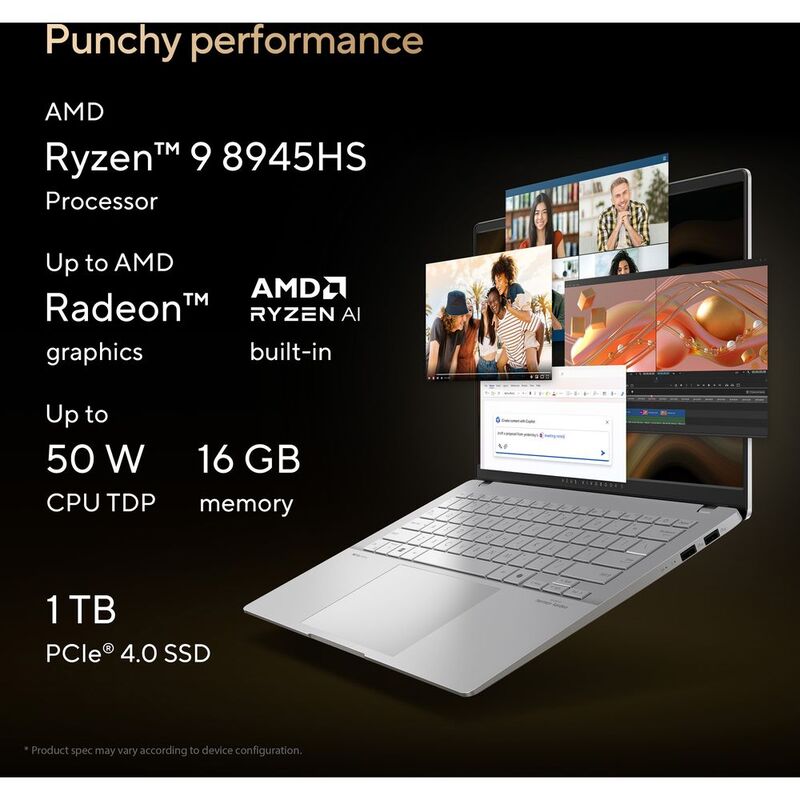 The ASUS Vivobook S 14 OLED transforms your laptop experience with cutting-edge technology and a sleek minimalist design. Powered by the AMD Ryzen™ 9 8945HS Processor, it delivers top-notch performance with a 50 W TDP2 and features the AMD Ryzen™ AI accelerator for intelligent workload optimization. The dedicated Copilot key7 provides instant one-touch access to AI capabilities. With a slim 1.39 cm profile, weighing 1.3 kg1, and up to a 14-hour battery life, it’s designed for on-the-go convenience. The laptop boasts a stunning OLED display, an ergonomic keyboard with RGB backlighting, an extra-large touchpad, and an ASUS AiSense camera. It’s your perfect companion for modern life.