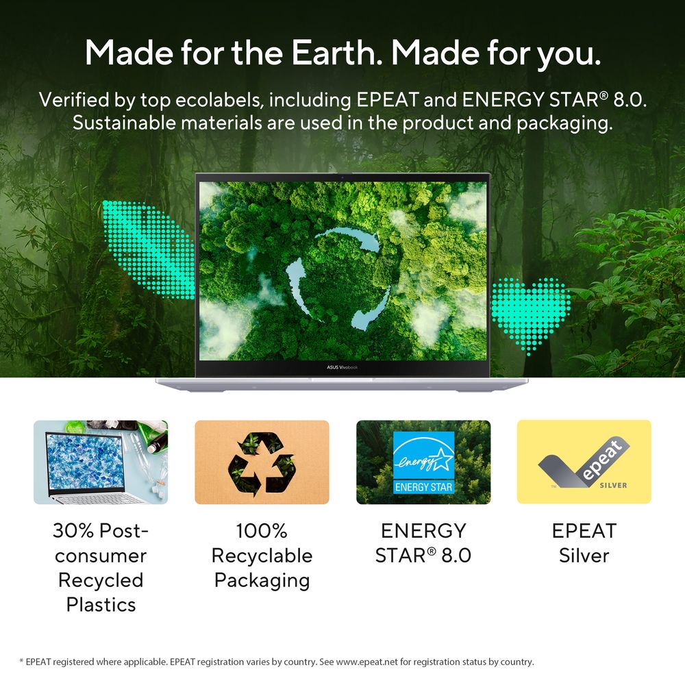 Elevate your experience with the sleek and sophisticated Zenbook 14 OLED ultraportable. Its thin-and-light design houses the power of the latest AI-enabled AMD Ryzen™ 8040 Series processors, which make AI tools fly, along with AMD Radeon™ graphics. A long-lasting battery ensures all-day power, and there's a full complement of I/O ports for enhanced connectivity. Its 180° hinge allows easy sharing, and you can dive into a world of sensory delight with the vibrant ASUS Lumina OLED display1 and cutting-edge super-linear speakers, while embracing the environmentally conscious design that exudes eco-elegance.