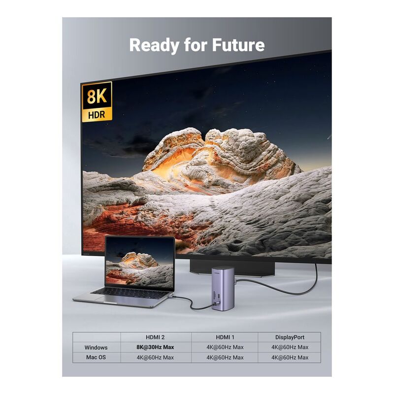 - 8K/4K HD Display: The HDMI2 port supports up to 8K@30Hz display for Windows and up to 4K@60Hz for macOS. The HDMI1 and DP ports support up to 4K@60Hz display for both Windows and macOS. Let you enjoy the ultimate visual experience.