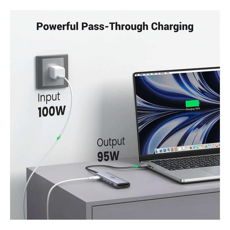 - Powerful Charging Capability The UGREEN 7-in-1 Hub supports charging up to 100W, providing fast and efficient power delivery to your devices while ensuring other peripherals stay connected. Keep your devices powered without the need for extra adapters.