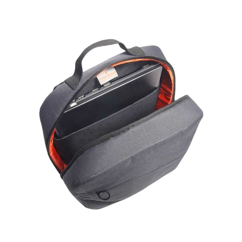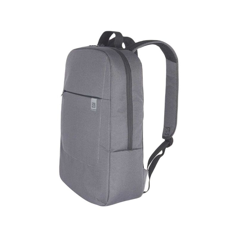 Backpack for Laptop 15.6" and MacBook Pro 16" made with fabric produced from recycled plastic. The convenient and roomy interior compartment features a protective pocket for your device. The adjustable, padded shoulder straps together with the ergonomic back, and external front pocket, make it convenient and useful for both work and leisure. Equipped with a trolley strap.