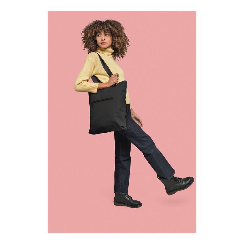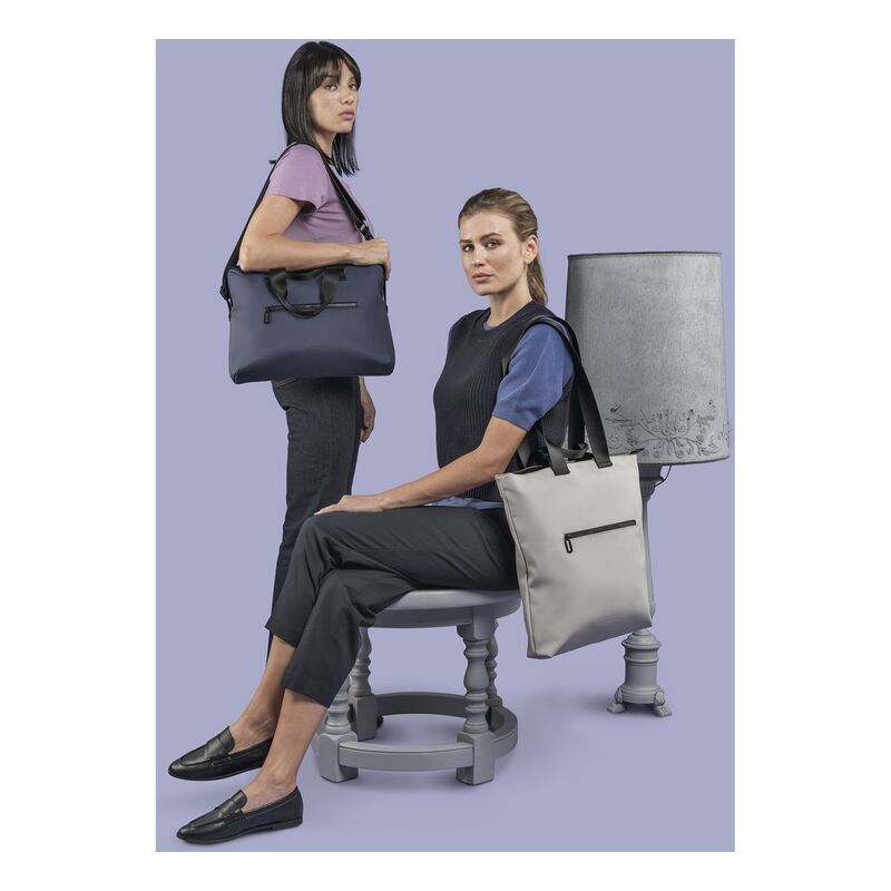 - TUCANO Gommo Shopper in rubberized material with a large central compartment featuring a padded pocket for laptops up to 14" and an external pocket for accessories. The Gommo bag has webbing handles and shoulder straps.