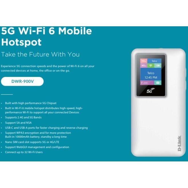 The D W R - 90 0 V Mobile Router is a 5G/LTE high speed broadband wireless WAN (WWAN) to Wi-Fi mobile hotspot. The DWR - 900V uses a 5G Internet connection to give you an easy-to-deploy Wi-Fi network anywhere you need one. Instead of limiting your mobile Internet connection to a single device through a USB dongle, the DWR - 900V allows you to create a Wi-Fi hotspot to share your connection. The convenient size means you can share your connection anywhere use it in a cafe to send e-mail while your friend reads the news, or at the airport so you and your coworkers can work while waiting for your plane.