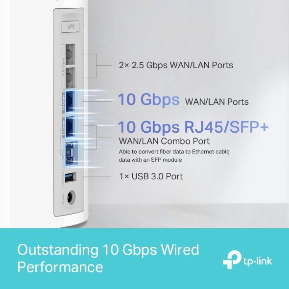 • Unprecedented 10 Gbps Network – 1× 10 Gbps Ethernet/Fiber Combo WAN/LAN port + 1× 10 Gbps WAN/LAN port + 2× 2.5 Gbps ports ensure max flexibility and boosted throughput.