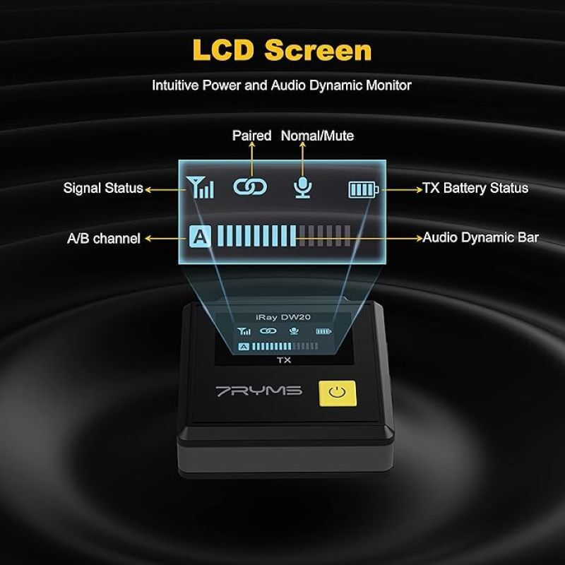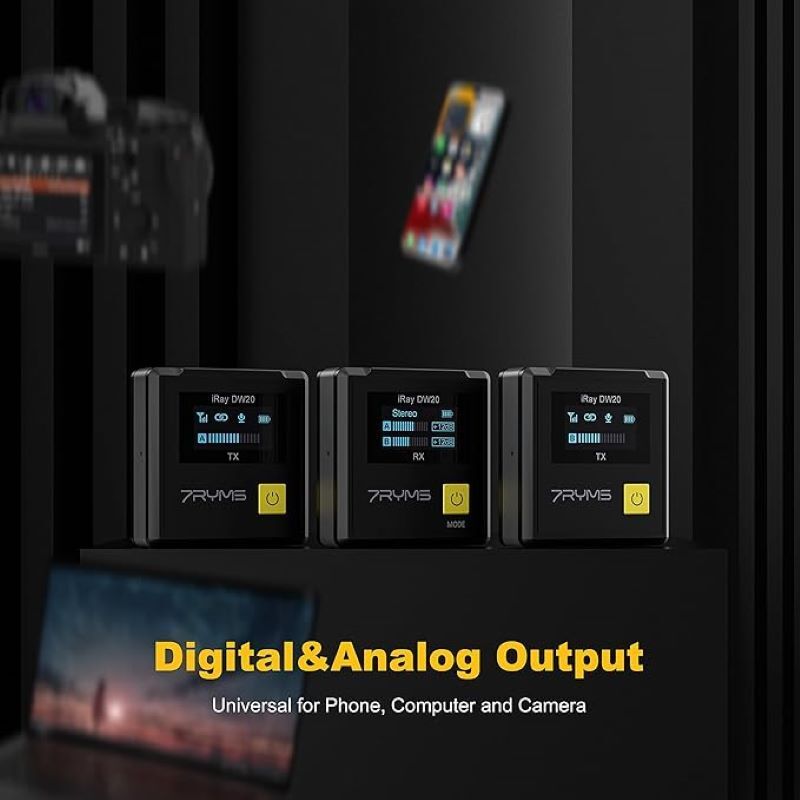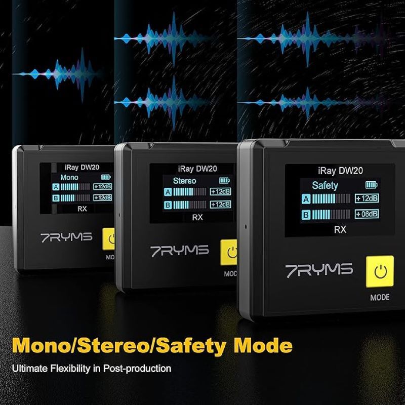 - Mono/Stereo and Safety Output Mode: 7RYMS iRay DW20 wireless lavalier microphone offers the flexibility to switch between mono, stereo, or safety output modes. The mono/stereo mode is perfect for post-production and caters to different scenarios, while the safety mode provides a backup audio recording at -6dB to prevent distorted or invalid recordings. (Please note: smartphones do not support stereo audio output)