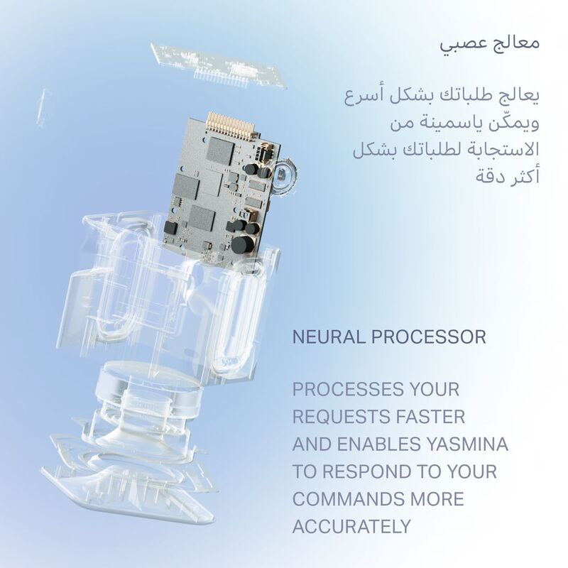 "Yasmina’s advanced microphone array features four microphones that ensures it receives your requests even in a large and noisy room. whether the ambiance is lively with conversation or hushed to a whisper, Yasmina remains responsive and ready to assist.