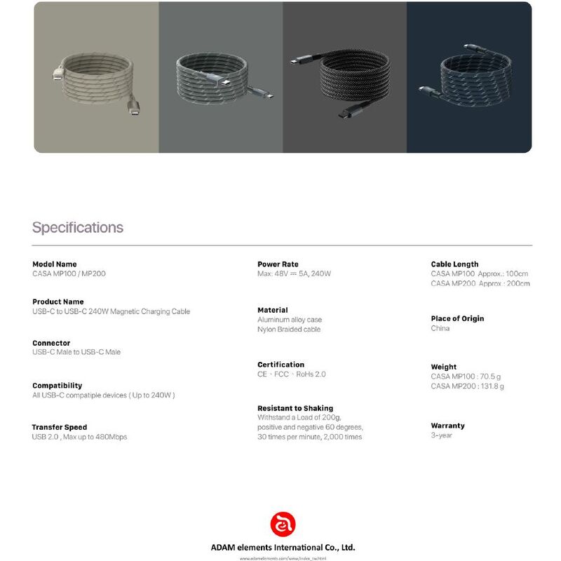 ADAM elements CASA MP100 USB-C to USB-C 240W Magnetic Charging Cable 1m - Gray
