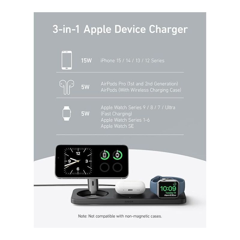 Anker MagGo Wireless Charging Station 15W 3-in-1 Pad With Cable And Wall Adapter