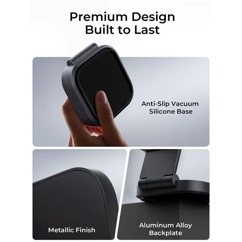 Quickly recharge your phone and AirPods case with the durable and travel-friendly LC-MC211 MagFusion L Qi2 2-in-1 Folding Magnetic Wireless Charging Station from AUKEY. The solid aluminum alloy backplate with anti-slip vacuum silicone base stays firmly in place on a tabletop or desk. You can use it as-is like any other wireless charging pad, or flip the top half up to charge a phone and an AirPods case at the same time, using the second wireless charging pad built into the base. The phone mount's pad features a strong magnetic connection and supports Qi2-certified charging for up to 15W of power output, with the base's pad providing up to 5W.