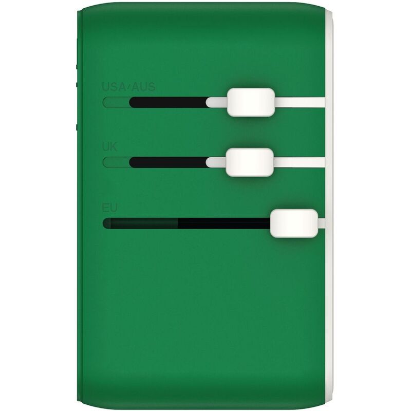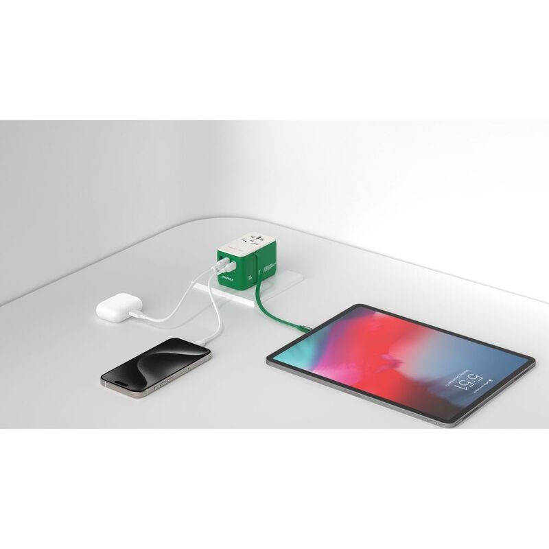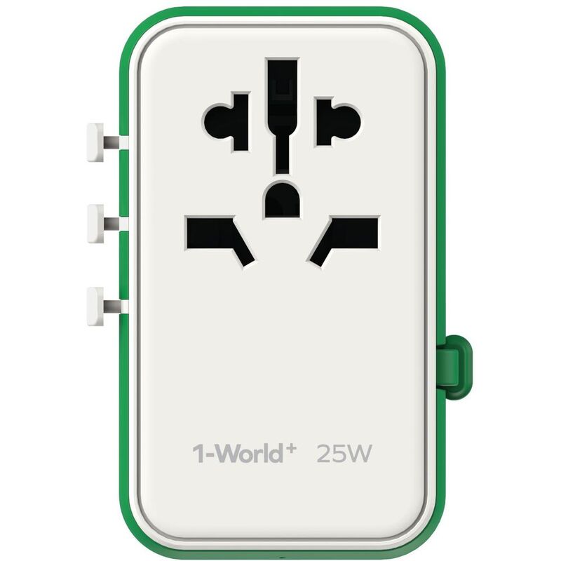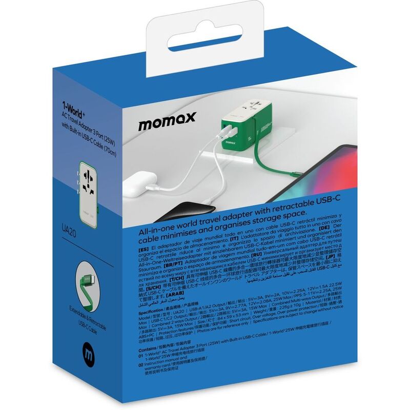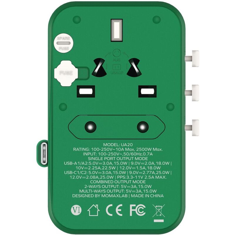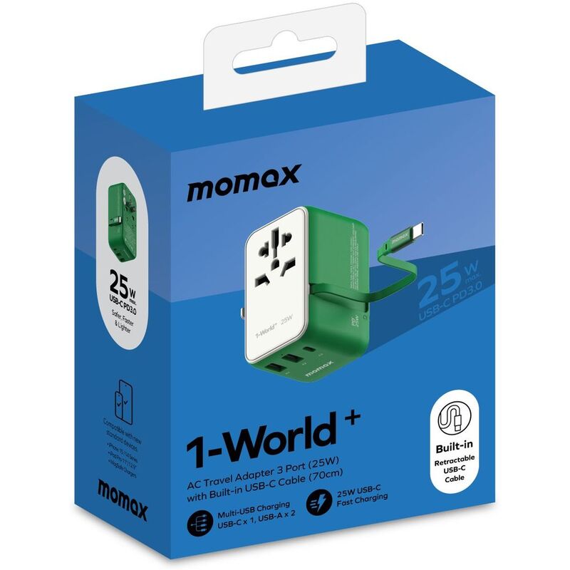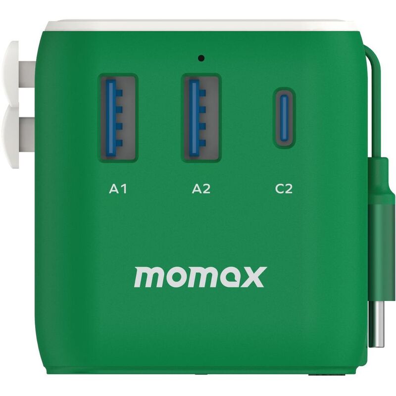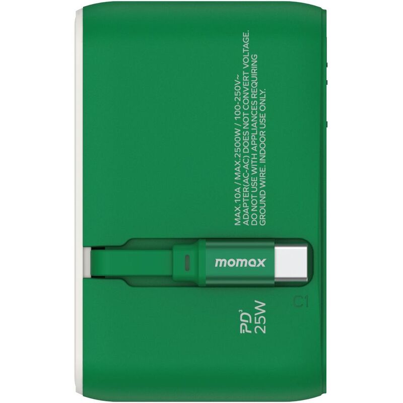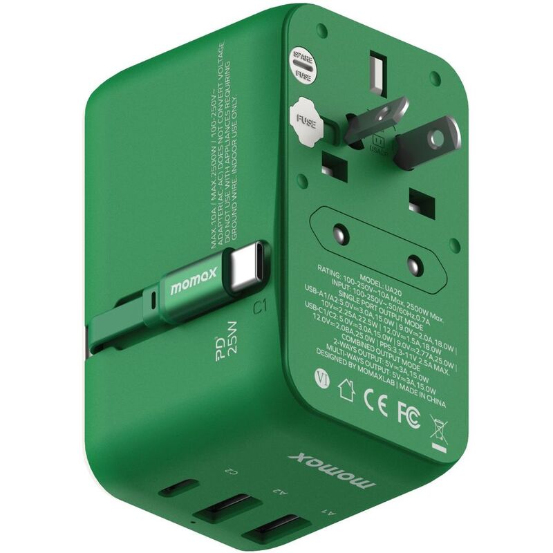 Momax 1-World+ 3-Ports Travel Charger with Built-In USB-C Cable (25W) - Green