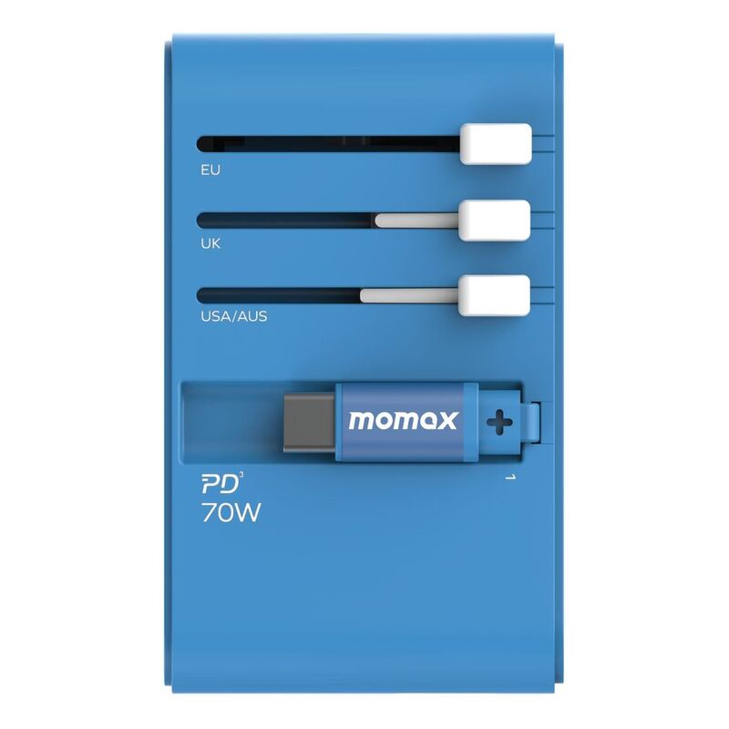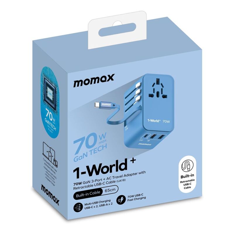 - Travel the world with confidence, charging your devices at lightning speedExperience the power of innovation with Momax's 1-World 70W GaN Retractable Cable Travel Adaptor (UA18). Engineered with cutting-edge GaN 3rd-generation technology, this sleek adaptor delivers a maximum power output of PD70W at a single port, revolutionising the way you charge your devices on the go.