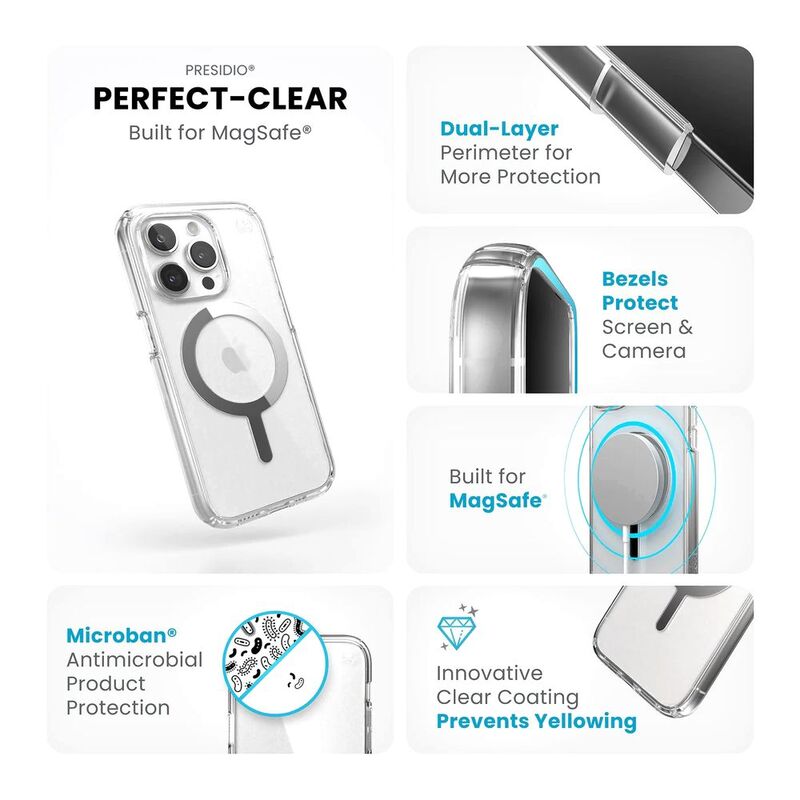 Presido Perfect Clear iPhone 15 PRO" Our Presidio® Perfect-Clear MagSafe® case is the clearest protective case, featuring 13-foot drop protection, Microban® antimicrobial product protection, is made from 50% recycled plastics, and is specifically built for all Apple MagSafe® chargers and accessories.