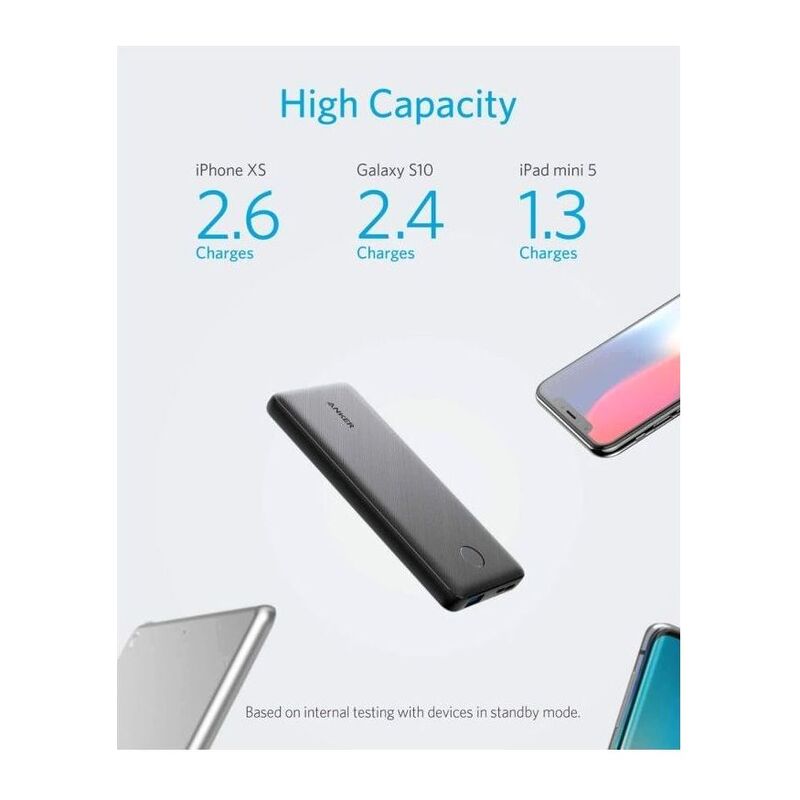 - Slim size, Big Power: One of the slimmest and lightest 10000 mAh portable chargers on the market. Provides 2. 6 charges for iPhone XS, 2. 4 full charges for Galaxy S10 and 1. 3 charges for iPad mini 5.