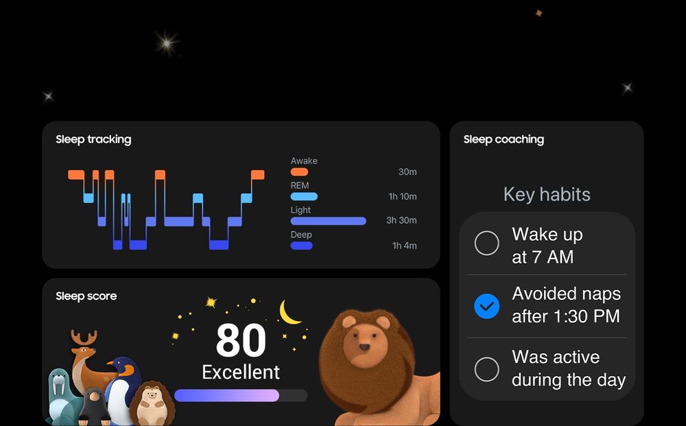 The slim, light Galaxy Fit3 rests snugly on your wrist, silently monitoring your sleep patterns through the night. Discover details about your sleep stages, snoring and blood oxygen. Find your Sleep score, get Sleep Coaching and have a good night's sleep you deserve. Multiple functions at your fingertips. Snap a photo, play tunes, check incoming calls and reply texts - all straight from your wrist, synced with your Galaxy smartphone. Your phone's missing? Ask your Galaxy Fit3 to ring your phone and help you locate it. Plus, you can back up your Watchfaces, apps, and more to keep your favorite settings.