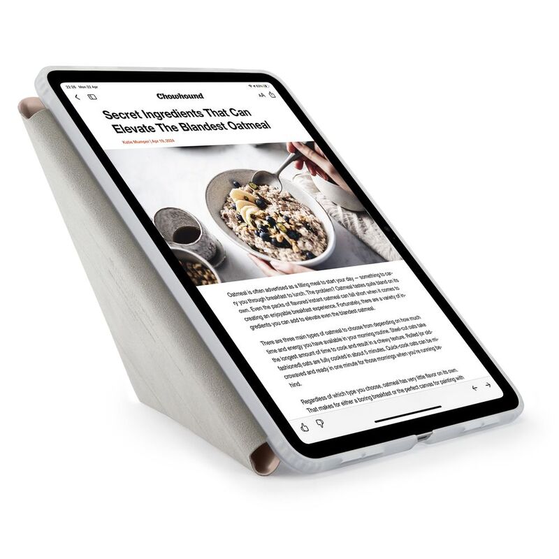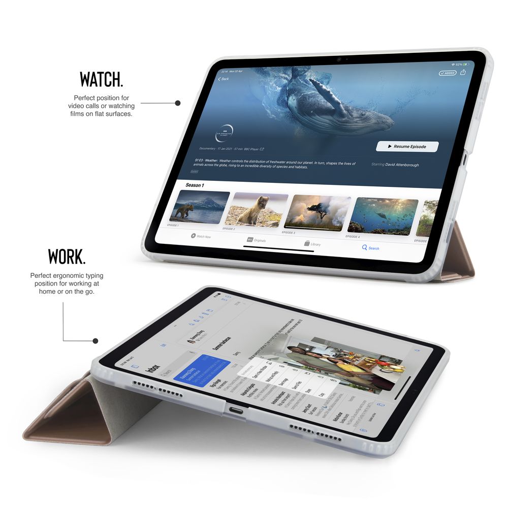 Versatile 5-in-1 folding design with its shock absorbent TPU shell, internal air pockets and magnetic front cover.