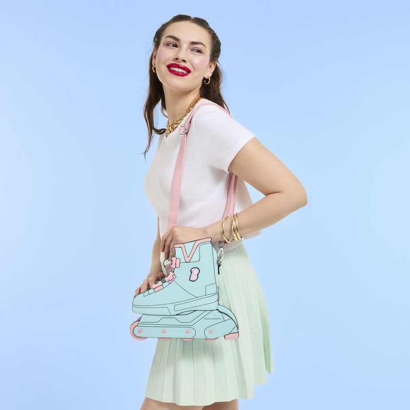 This crossbody bag is in the shape of a blue rollerblade inline skate! The Barbie "B" logo is embroidered on the side, and you'll find pink wheels that actually move!