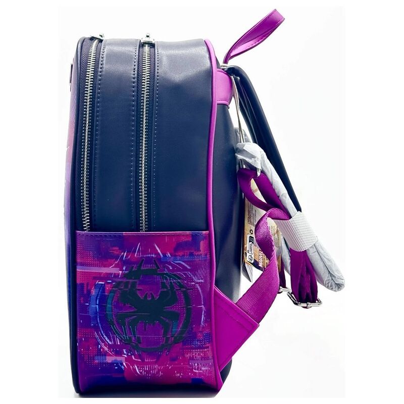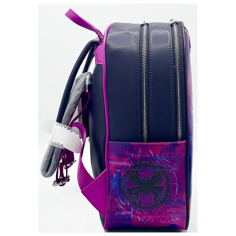 Join Miles Morales on an epic adventure with this Loungefly Across The Spider Verse Mini Backpack! Inspired by the iconic Marvel Spiderman masterpiece, this bag features a purple exterior with portraits of characters Pavitr Prabhaker, Gwen Stacey, Jessica Drew, Hobie Brown, Spider Cat, Miguel O'Hara, Ben Reilly and also Margo Kess. The piece is then finally complete with the classic double ip fastenings and signature enamel logo.