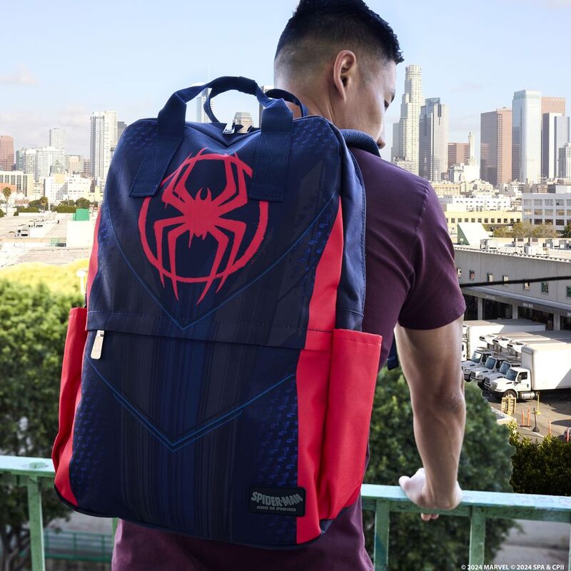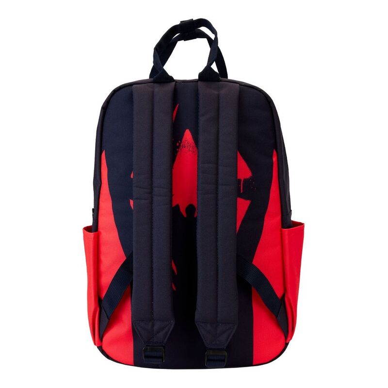 Let's do this one more time! Bitten by a radioactive spider, Miles Morales takes the role of Spider-Man on the Loungefly Spider-Verse Miles Morales Suit Full Size Nylon Backpack. On the front, a graffiti-style spider symbol appears below the bag's top handle. Details of his hero suit continue onto the zipper pocket below, and the spider symbol makes an encore appearance on the bag's back. This backpack makes a heroic addition to your next mission and will keep your belongings safe on your interdimensional travels.