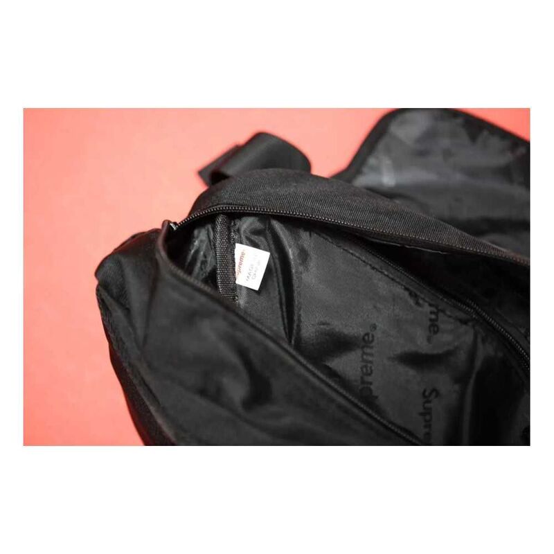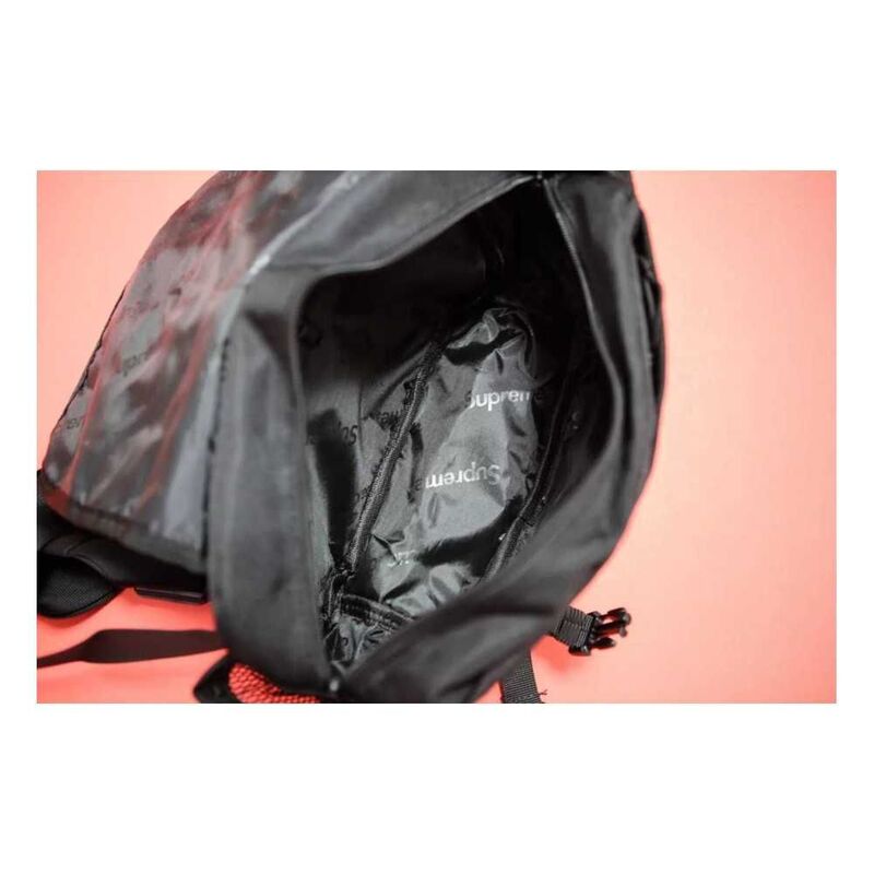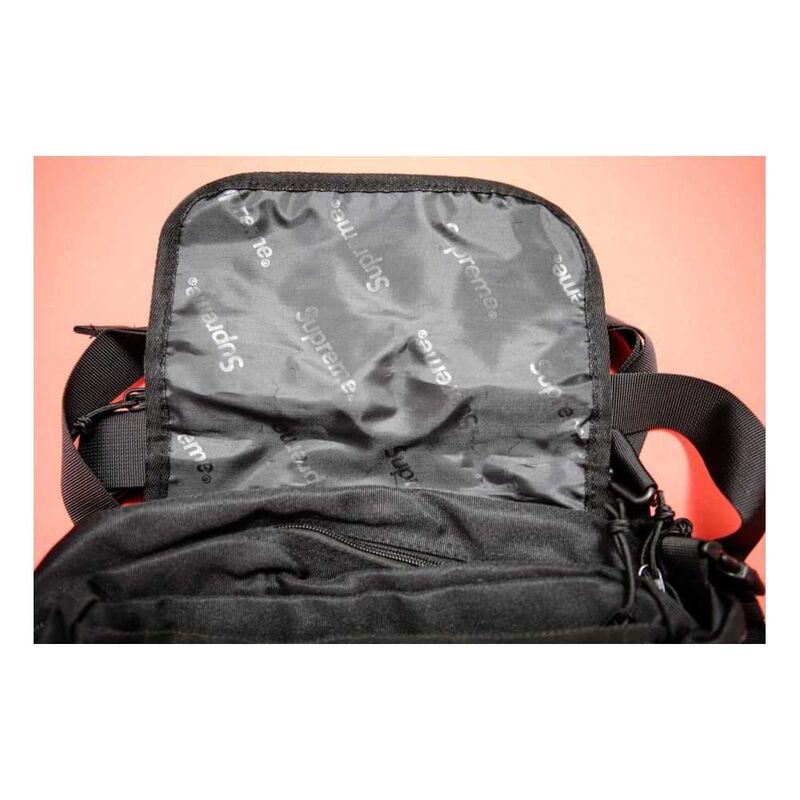 The Supreme (SS20) Mesh Side Bag in black is crafted from durable Cordura fabric and PVC-coated breathable mesh, highlighted by a reflective 3M Supreme logo on the front. With an outer pocket and an adjustable strap, its compact design makes it ideal for carrying your essentials in style.