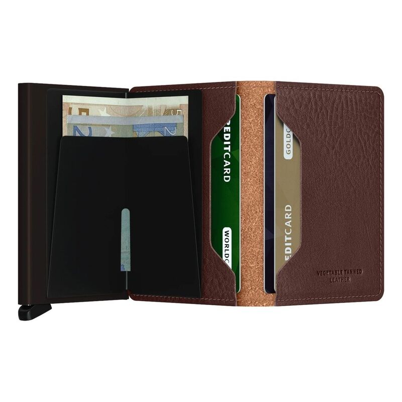 Slimwallet leather is cut wider than the leather of the Miniwallet, providing space for extra cards, bills, business cards, and receipts. The Slimwallet is less suitable for coins.
