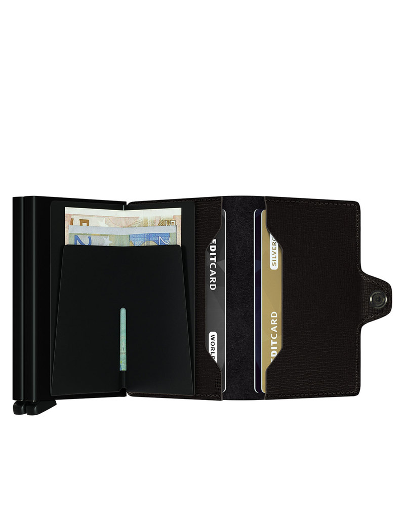 تحتوي محفظة توين والت على حاملي بطاقات داخل الحافظة الجلدية مع زر إغلاق بالكبس. مع محفظة توين والت، يمكنك حمل من 8 إلى 12 بطاقة معك بأمان. توفر المحفظة مكانًا بالداخل لبضعة بطاقات وأوراق نقدية وإيصالات وبطاقات العمل وبعض العملات المعدنية.