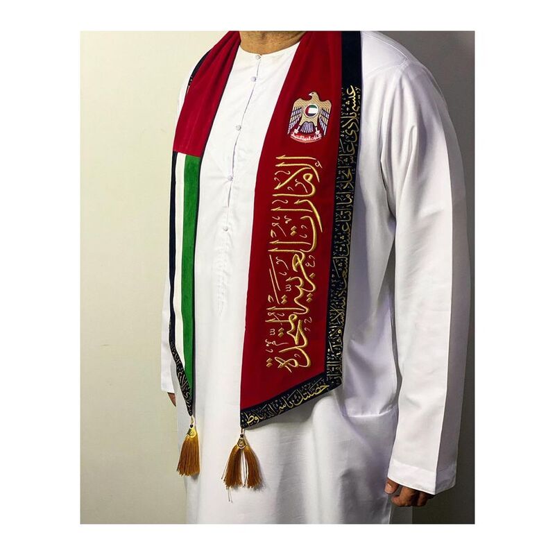 A curved black and red soft velvet textured scarf with 3D UAE state logo embroidered in gold color. It has tassels engraved with UAE logo on 1 side