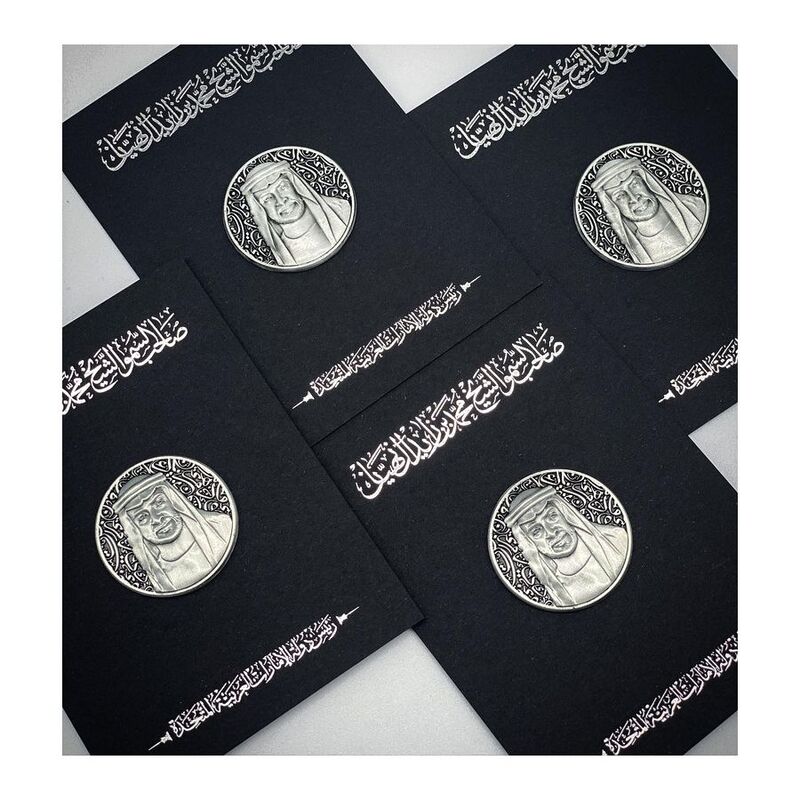A silver solid metal pin magnet badge with the image of Sheikh Mohamed bin Zayed in a distinctive 3D design.