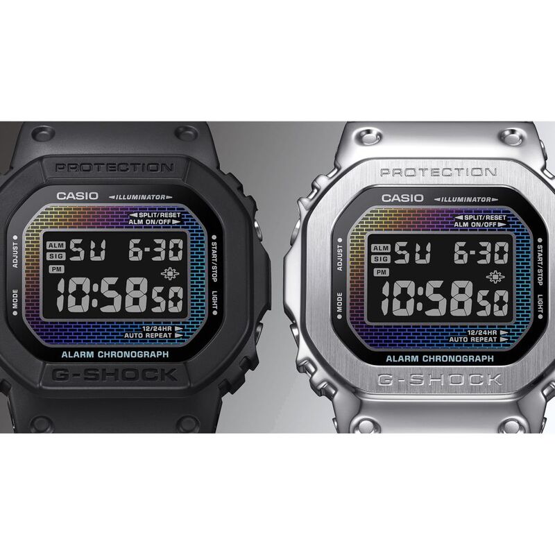 For the DW-5600 and GM-5600 models, the watch glass features the color-shifting brick pattern reproduced with vapor deposition in a rainbow-hued gradation. For the GA-2100 and GM-2100 models, the dial’s iridescent brick pattern is achieved with a combination of silver vapor deposition, laser etching, and rainbow-colored printing.