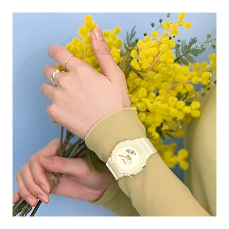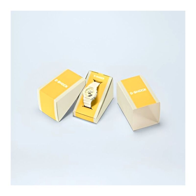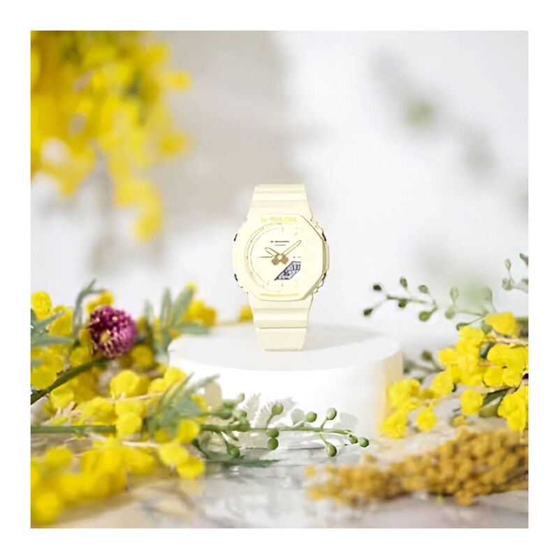 Monochromatic finishes in vibrant colors dynamic turquoise blue (new color), bright pink, and classic white lift the spirit, and the 9 o’clock inset dial from the original GMA-S2100 is left behind for a streamlined, minimalist look.