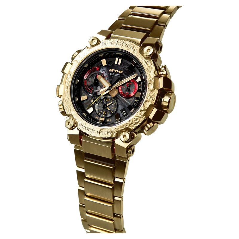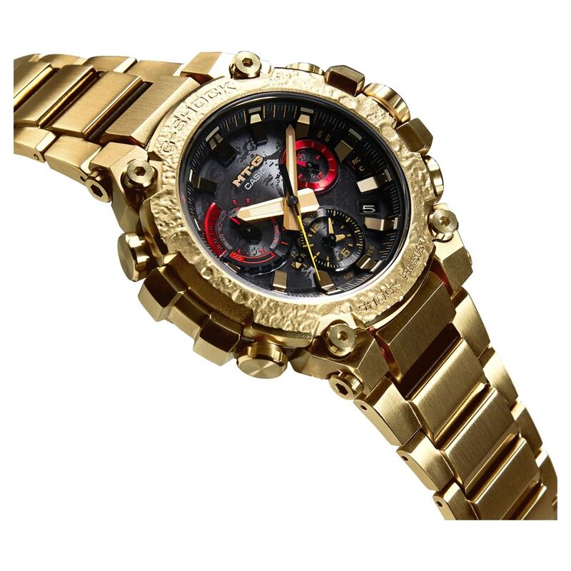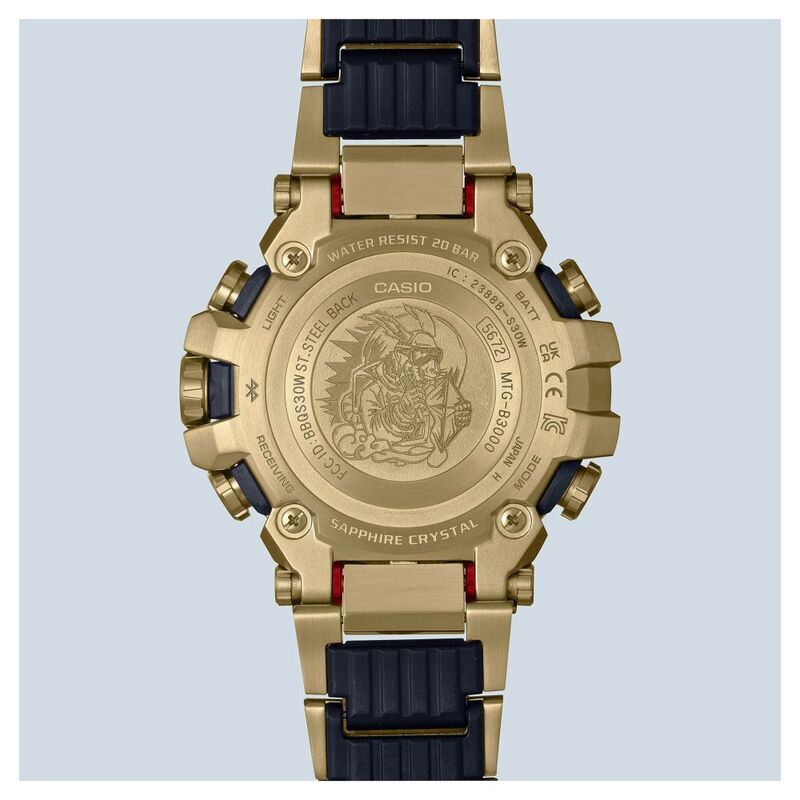 The MTG-B3000 features a Dual Core Guard structure, which protects the module in a carbon-reinforced resin case and encloses the exterior in metal components. Repeated pressing, cutting, and polishing builds the stainless steel case back upward into an intricate 3D form. The case back also includes the lugs to secure the band and the guards for crown and buttons, for a completely new structure and a more compact, slimmer timepiece.