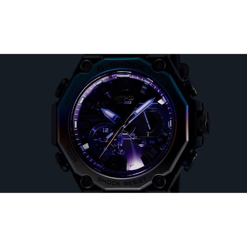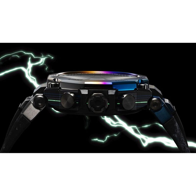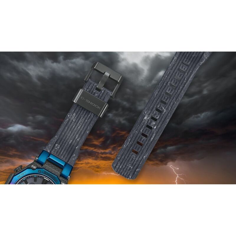 The awesome grandeur of nature is captured with a multi-colored, multilayer carbon frame and rainbow ion-plating. The frame, constructed of layers of laminated carbon and glass fiber sheets, is treated to a phosphorescent finish, creating the look of dark skies with approaching storm clouds and a piercing flash of lightning. The stainless-steel bezel is ion-plated in two distinct colors, then finished with beautiful gradations to project the capriciousness of rapidly changing weather conditions.