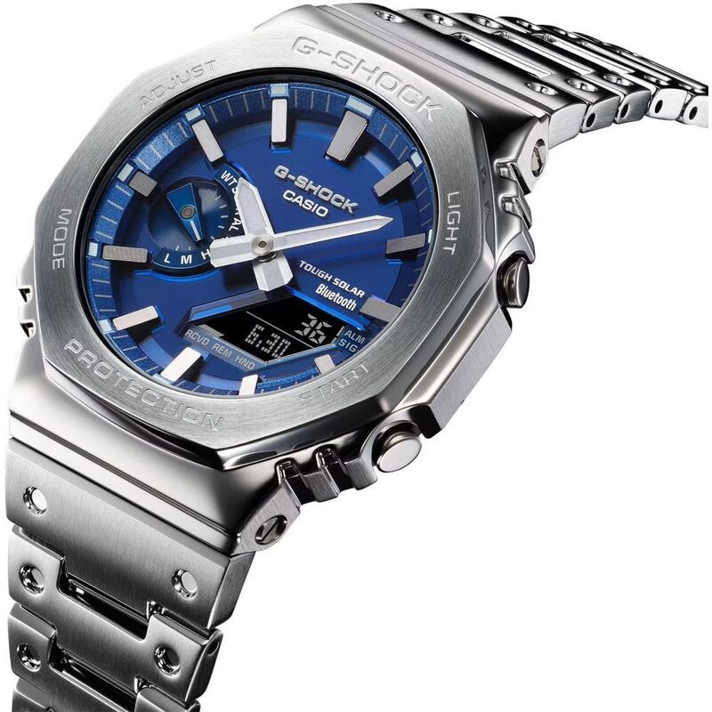 Add a touch of color to your classic style a full-metal G-SHOCK with vibrant blue dial. The dial is finished in metallic blue vapor deposition, adding a striking touch of originality to the iconic stainless-steel bezel and band design. Buffering components made of fine resin are installed between the bezel and case, with a three-pronged structure dispersing shocks to the band's connecting pipes, to deliver all the shock resistance of a G-SHOCK in a full-metal timepiece. And the case back features a screw-lock construction to ensure a tight seal. The metal band pieces are dimpled to reproduce the look of the resin band design of the very first G-SHOCK. The stainless-steel bezel is meticulously forged, cut, and polished for stunning depth and dimension. A hairline finish is applied to the bezel top and a mirror finish to the beveled edges, creating a smart metal timepiece that truly shines.