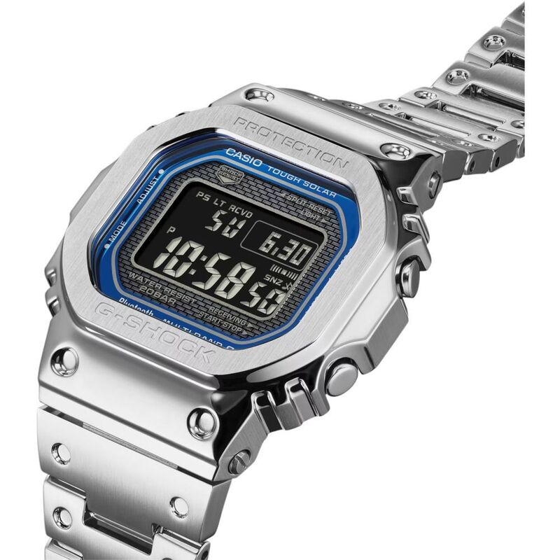 Add a touch of colour to your classic style - a full-metal G-SHOCK with vibrant blue dial accent. The watch face is outlined in metallic blue vapour deposition, adding a striking touch of originality to the iconic stainless-steel bezel and band design. Buffering components made of fine resin are installed between the bezel and case, with a three-pronged structure dispersing shocks to the band's connecting pipes, to deliver all the shock resistance of a G-SHOCK in a full-metal timepiece. And the case back features a screw-lock construction to ensure a tight seal. The metal band pieces are dimpled to reproduce the look of the resin band design of the very first G-SHOCK. The stainless-steel bezel is meticulously forged, cut, and polished for stunning depth and dimension. A hairline finish is applied to the bezel top and a mirror finish to the beveled edges, creating a smart metal timepiece that truly shines.