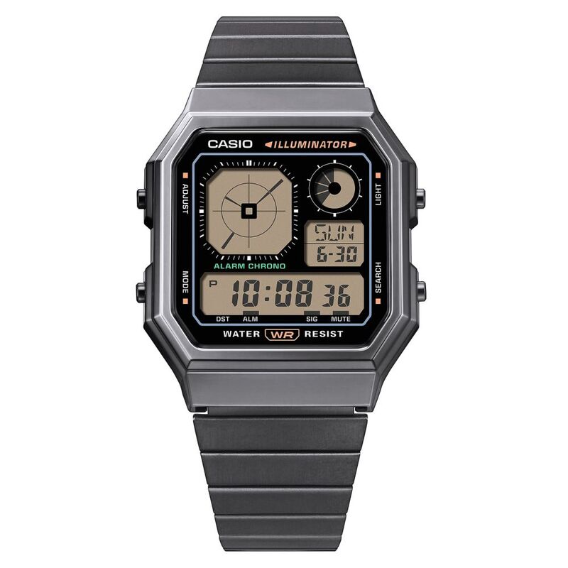 A digital watch featuring an analog-style clock display all wrapped up in the gadgety look you love.