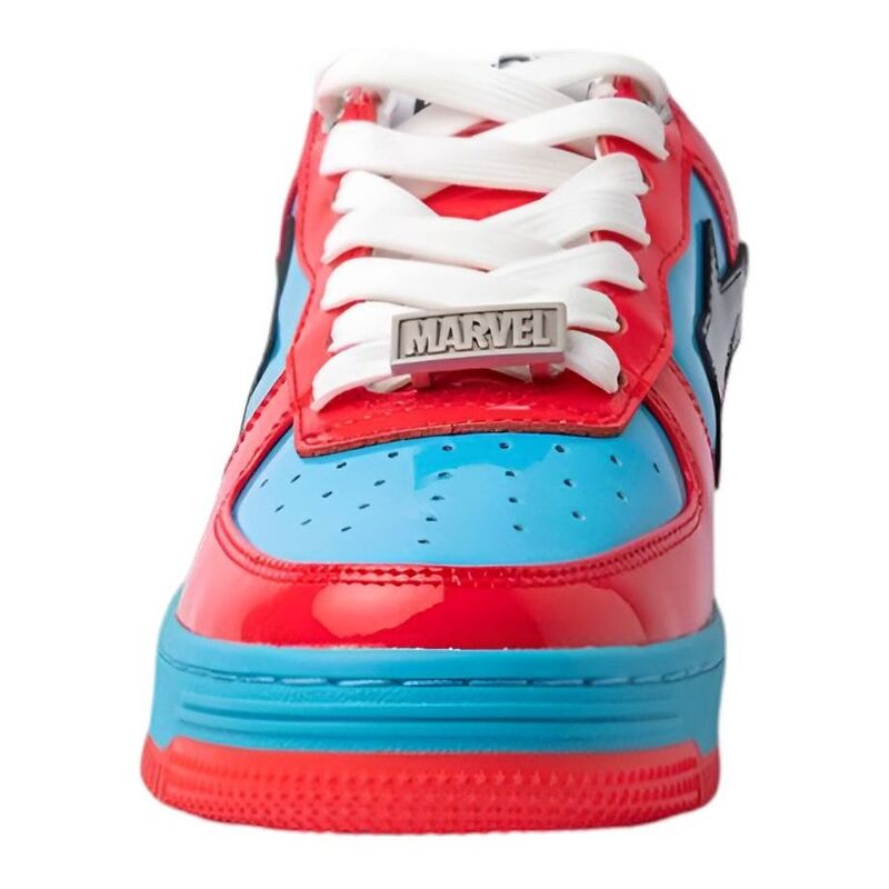 These sneakers feature a Spider-Man-themed upper made of patent leather, adorned with black BAPE STA star-shaped logos, the embroidered ‘MARVEL’ logo, and the Spider-Man character. The character’s theme extends to the sole unit, featuring a blue midsole with ‘BAPE’ typography at the heel and a red rubber outsole.