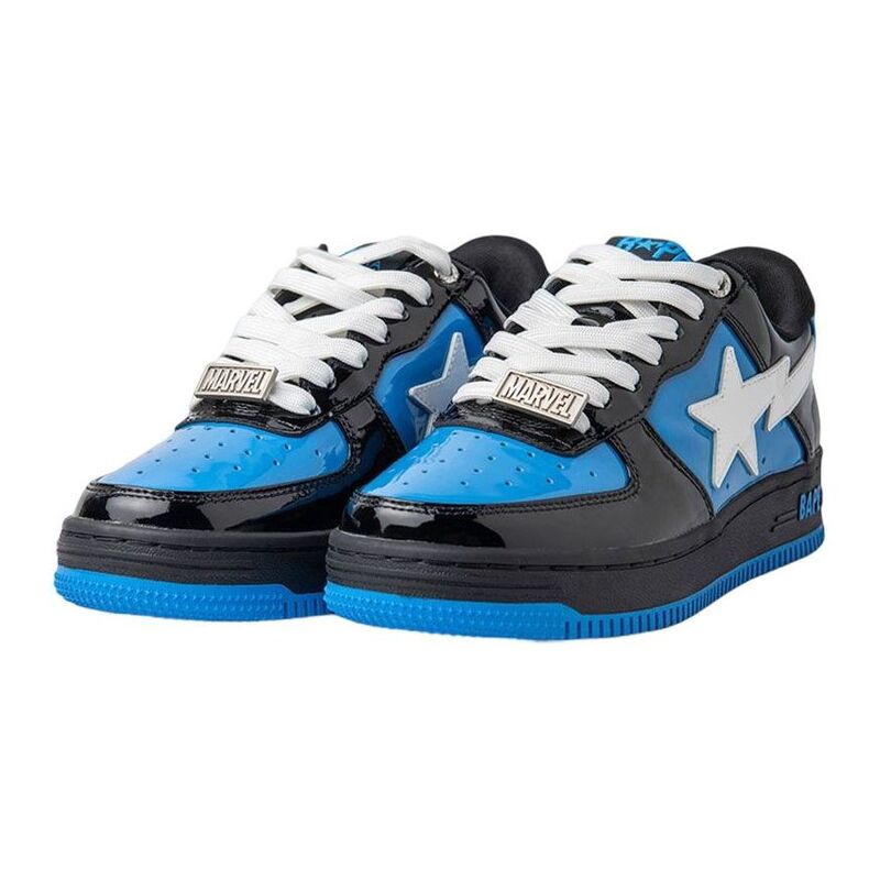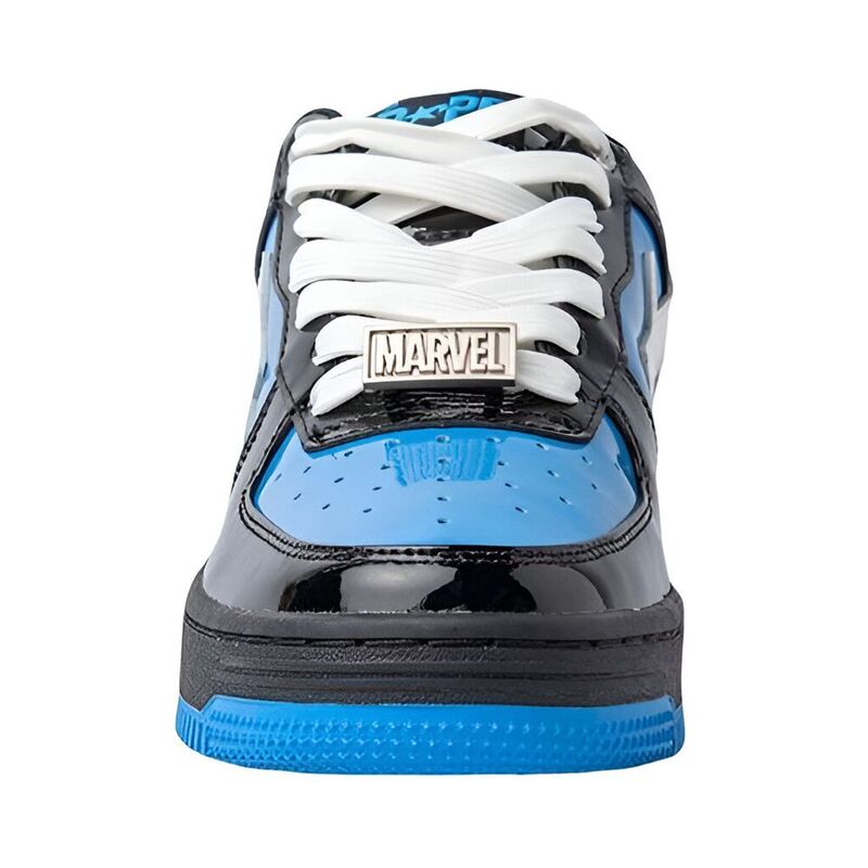These sneakers feature a Marvel-inspired design in blue and black patent leather, with a white star logo. A cartoon graphic of Venom adorns the design, complemented by the embroidered Marvel branding. The insole features comic book strips of Venom, while the entire sneaker is rounded out by a colored sole unit.