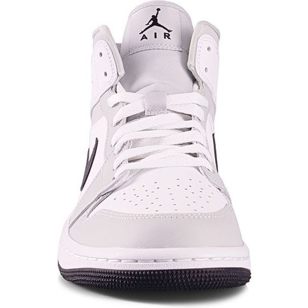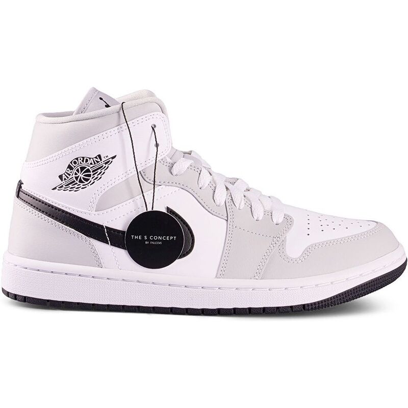 This version of the mid-top Air Jordan 1 features a full leather construction, combining a white and light smoke grey base with sleek black accents highlighting the branded areas. Crisp white laces and a matching midsole sit atop a black rubber outsole, rounding out the design that blends style with classic appeal.