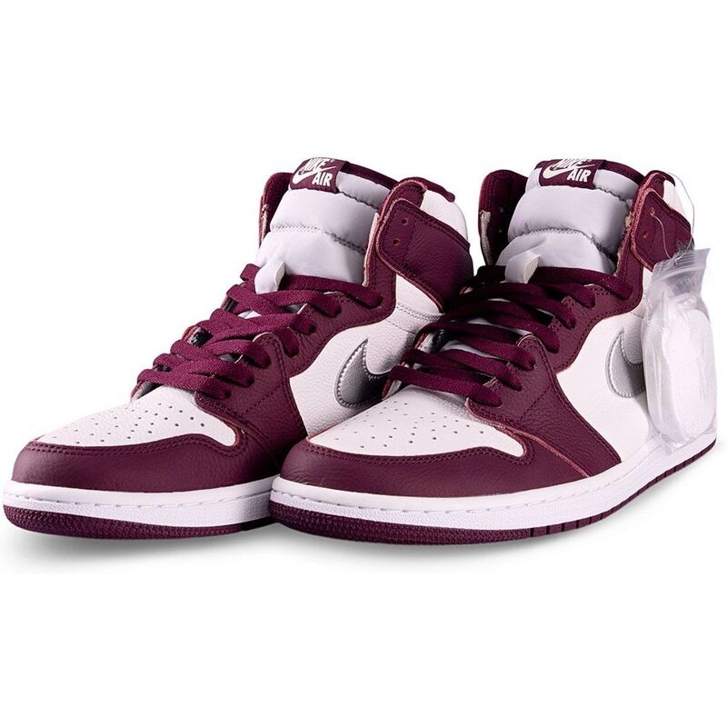 The Air Jordan 1 Retro High OG 'Bordeaux' artfully adorns the classic silhouette with a pristine white leather upper and deep vinous leather overlays at the forefoot, heel, and collar. Echoing the elegance of the CO.JP 'Midnight Navy' colorway, this sneaker is elegantly accented with a metallic silver Swoosh and a jeweled Wings logo on the lateral ankle for a touch of luxury. A woven Nike Air tongue tag rests on the lightly padded nylon tongue, offering a nod to the original design.